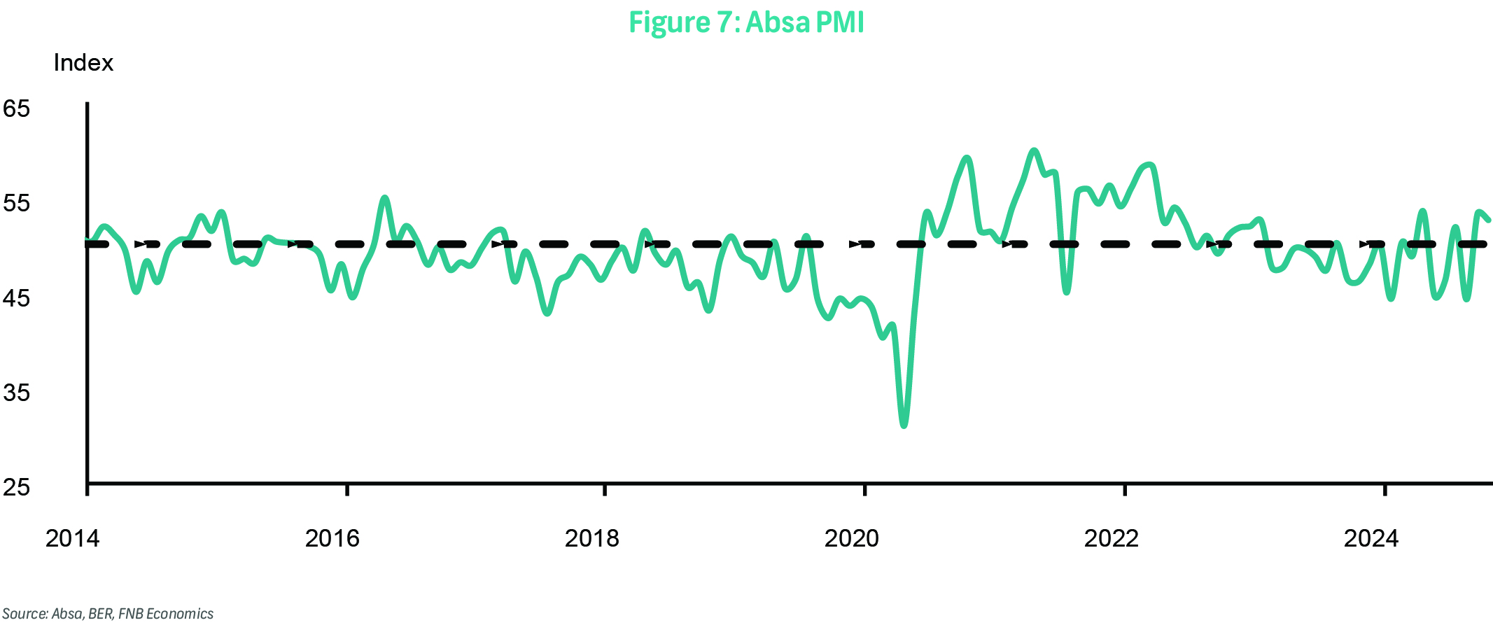 The FNB/BER Building Confidence Index remained unchanged at 40 index points in 4Q24. While this indicates that most respondents (60%) are still dissatisfied with current business conditions, there are some positive developments. Main contractors experienced a significant improvement in activity, employment, and profitability, leading to a decade-high confidence level. This was driven by increased activity, particularly in residential building, which partially recovered after a weak performance in previous quarters. Non-residential activity also continued to increase, albeit from a low base. However, despite the positive momentum, main contractors are still concerned about the short-term outlook due to weak order books and the ongoing impact of the construction mafia. Sub-contractors, on the other hand, faced challenges due to a decline in residential solar installations, leading to decreased confidence. While building material manufacturers saw some improvement in production and reduced costs, overall confidence remains low. Architects and quantity surveyors experienced some improvement in activity but were hindered by municipal delays and payment issues. Overall, the survey shows a mixed outlook for the building sector. While current work is generally plentiful, capacity constraints at a municipal level and security issues at construction sites linger, weighing on sentiment.