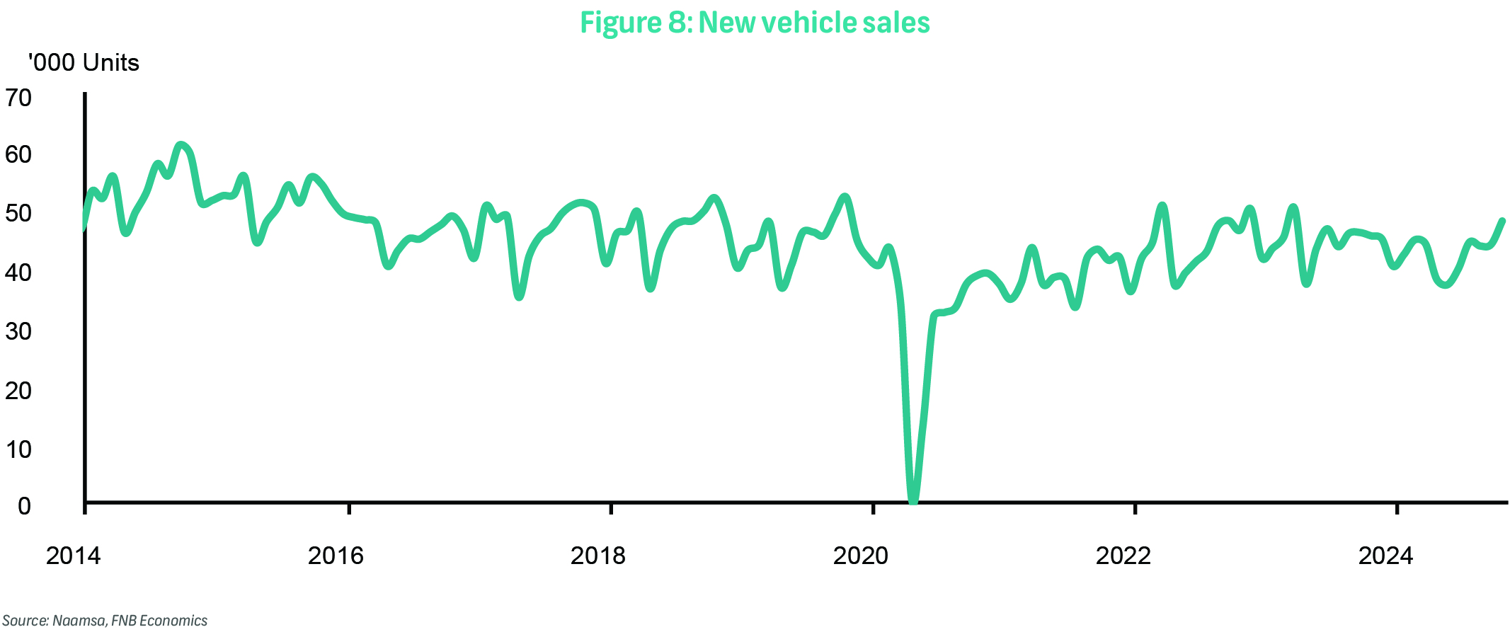 Also on Monday, data on new vehicle sales for November will be released. New vehicle sales recorded 47 924 units in October, up by 2 506 units or 5.5% relative to October 2023. Passenger car sales recorded an increase of 14.5% y/y, with car rental sales accounting for 19.8% - supported by seasonal demand. Light commercial vehicles, bakkies, and mini-bus sales declined by 12.7% y/y, while medium and heavy truck and bus sales declined by 10.1% y/y and 7.1%, respectively. Slower inflation and a continued fall in interest rates should support the consumer environment, providing further impetus to passenger car sales going into 2025.