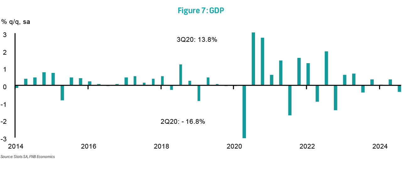 On Thursday, the current account balance for 4Q24 will be released. The current account deficit narrowed further to R70.8 billion in 3Q24 from R75.3 billion in 2Q24. As a percentage of GDP, the current account deficit was 1.0%. The improvement came despite a slightly narrower trade surplus on goods, which decreased from R179.5 billion to R177 billion (2.4% of GDP), but rather reflected a narrowing in the services, income, and transfer account deficit (SIT), from -R254.7 billion to -R247.8 billion (-3.4% of GDP). There was a decline in total export values, which was worse than the decline in imports, and both reflected lower prices and volumes. South Africa's terms of trade improved, highlighting a faster fall in rand-denominated import prices versus the prices of exports. This data suggested that the deterioration in the current account deficit for 2024 would likely be less pronounced than previously feared. However, logistical constraints remain a key hindrance to export growth and, alongside rising domestic demand, increases the odds of worse current account dynamics over the medium term.