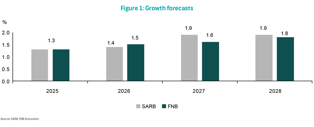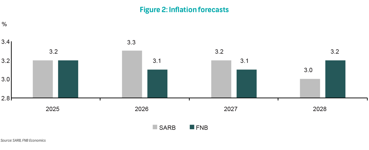 The MPC views SA's economic growth as more stable. After four consecutive quarters of expansion, the economy is expected to continue growing in 4Q25. However, unlike most of 2025, growth in investments should compound gains from household spending over the medium term. That said, the SARB has not changed its growth forecast but noted upside risk instead. We see slightly higher growth this year but slower than the SARB over the period to 2028 (Figure 1). Should the SARB's upside risk materialise while coupled with productivity enhancements, this would still allow policy to shift into neutral territory.