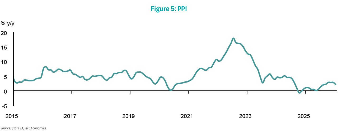 Also on Thursday, producer inflation data for February will be released. In January, producer inflation slowed to 2.2% y/y, from 2.9% in December. On a monthly basis, producer prices declined by 0.2%, reflecting a fall in food and fuel prices. Food prices declined by 0.4% m/m, underscoring a 5.4% monthly drop in meat prices. We expect producer inflation to remain muted around the 2.0% handle in February, supported by a resilient rand and lower fuel prices.