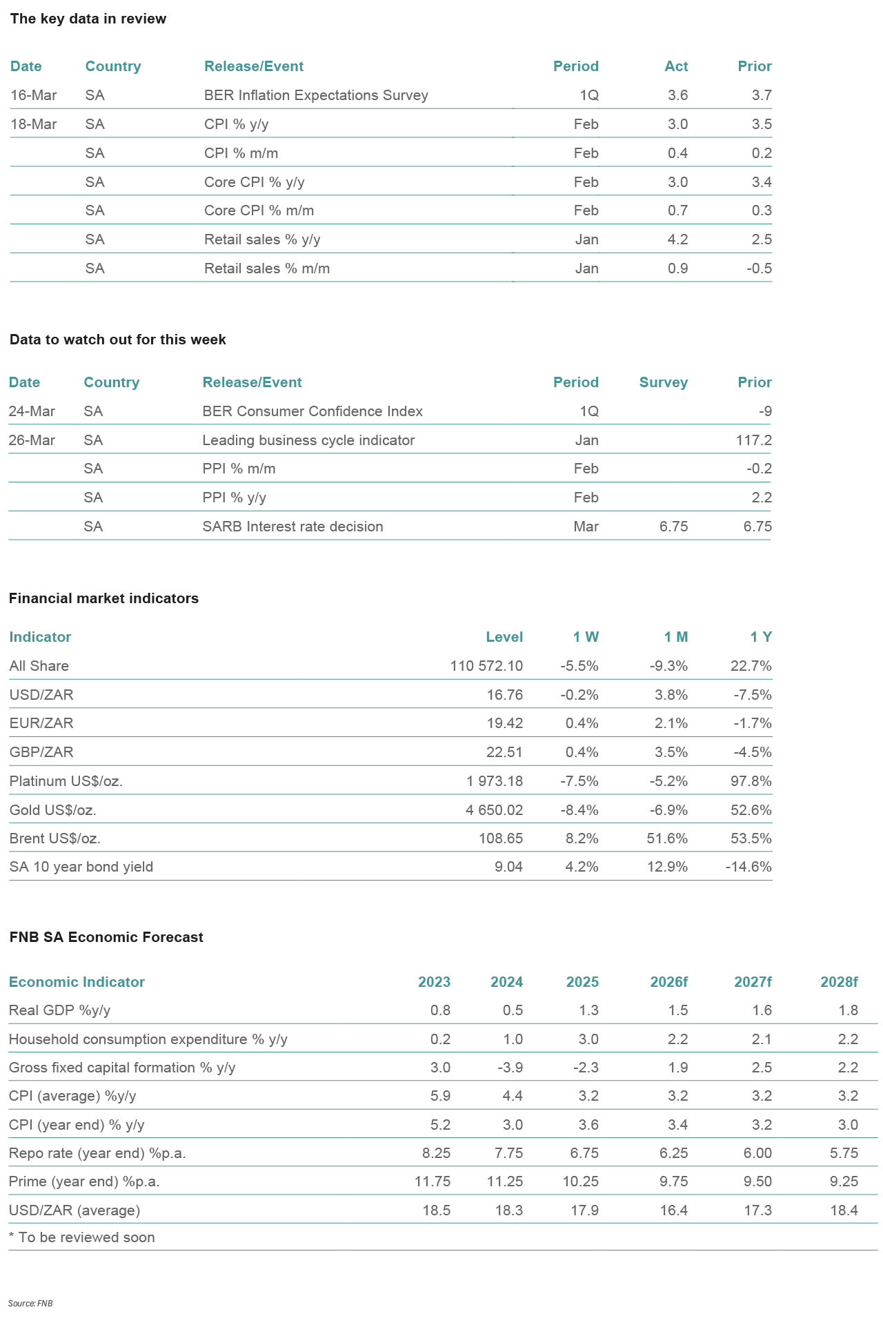 The South African Reserve Bank's (SARB) Monetary Policy Committee (MPC) will announce its second interest rate decision for 2026 on Thursday, 26 March. While there was a split on whether they would cut interest rates or leave them unchanged at the January meeting because expected inflation provided ample space for continued easing, the market was less split on expectations of a cut in March. This was before the war that is currently raging through the Middle East. Since then, the degree of uncertainty around the inflation trajectory has risen, and a conservative MPC may not want to make further moves downward during these volatile times. We remain constructive on the South African (SA) economy's outlook, but we are confronting an inflation shock that is likely to reverberate across the entire economy and sustain shifts in expectations.