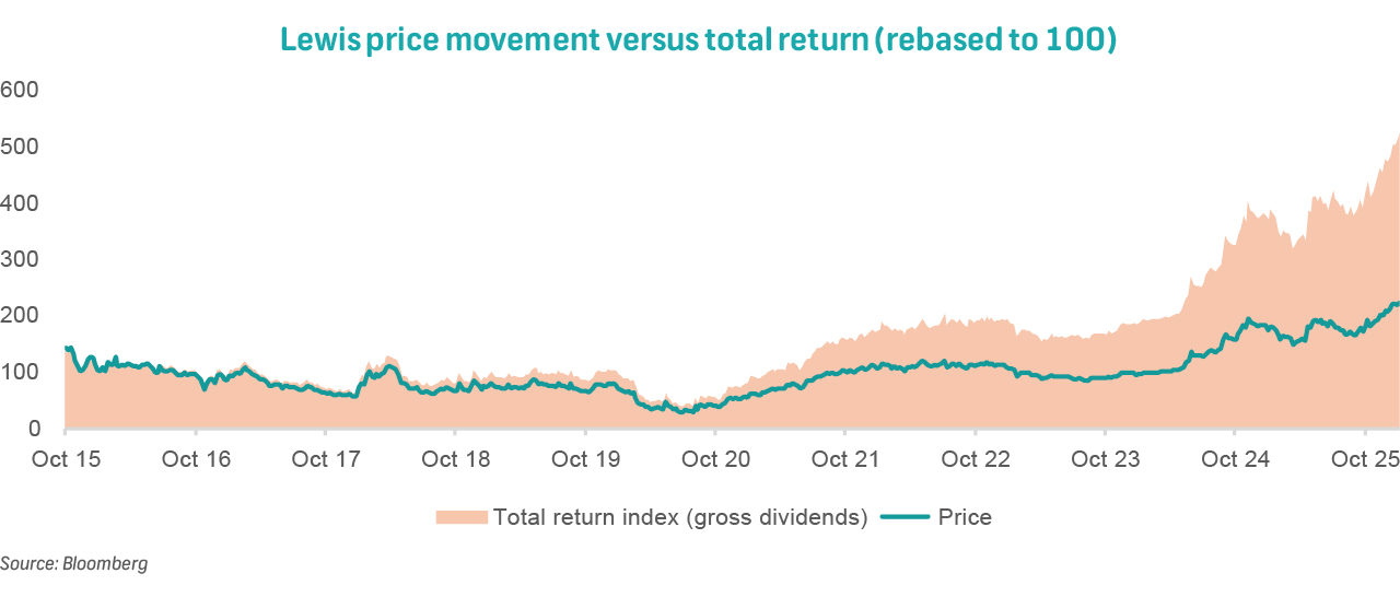 Since listing, Lewis has paid uninterrupted dividends. The growth in the dividend was interrupted during the Covid-19 period but resumed in FY21 and has averaged 25% per annum since.