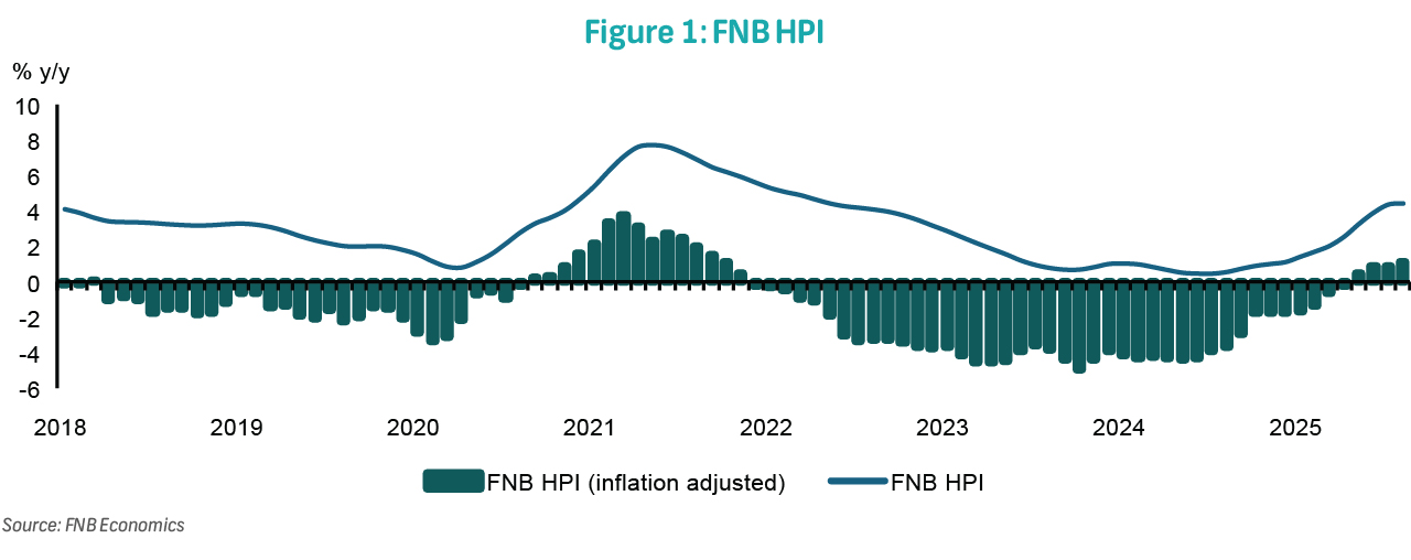 The FNB House Price Index (HPI) accelerated to 4.5% y/y in August, up from a revised 4.4% in July (previously 3.7%) (Figure 1). This marks the fastest annual house price growth in over three years, last seen in May 2022 when interest rates were significantly lower (275-basis points below current levels). This is also the fourth consecutive month of real house price growth.