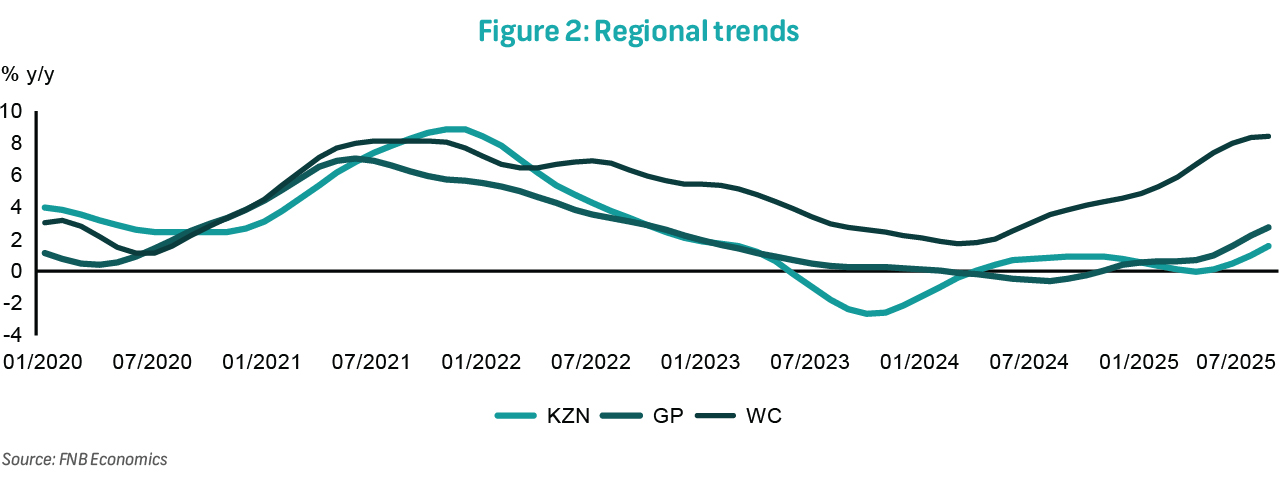 The Western Cape continues to lead in house price growth, underpinned by robust demand fundamentals. Meanwhile, Gauteng and KwaZulu-Natal (KZN), which showed stagnant growth earlier in the year, are now gaining momentum (Figure 2). Recent data points to a turning point for these regions, with price growth picking up from a relatively low base. As a result, the gap between the Western Cape and other provinces is narrowing, with broader regional contributions suggesting a geographically expanding recovery.