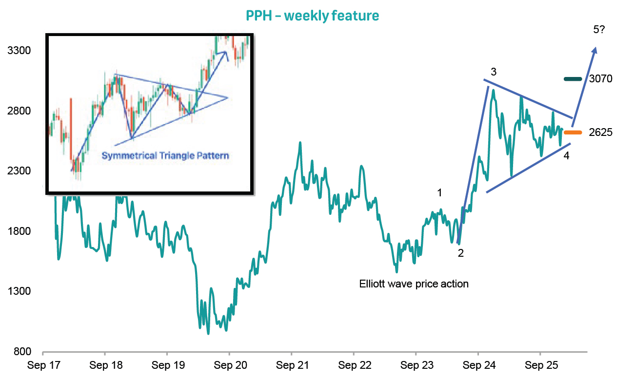 Our profit target is maintained at R42.00, with an initial and trailing stop-loss set at R35.00. |